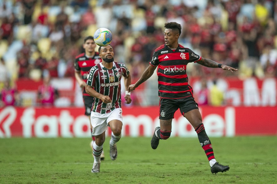Bruno Henrique e Samuel Xavier no clássico entre Flamengo e Fluminense — Foto: Guito Moreto - Ag O Globo