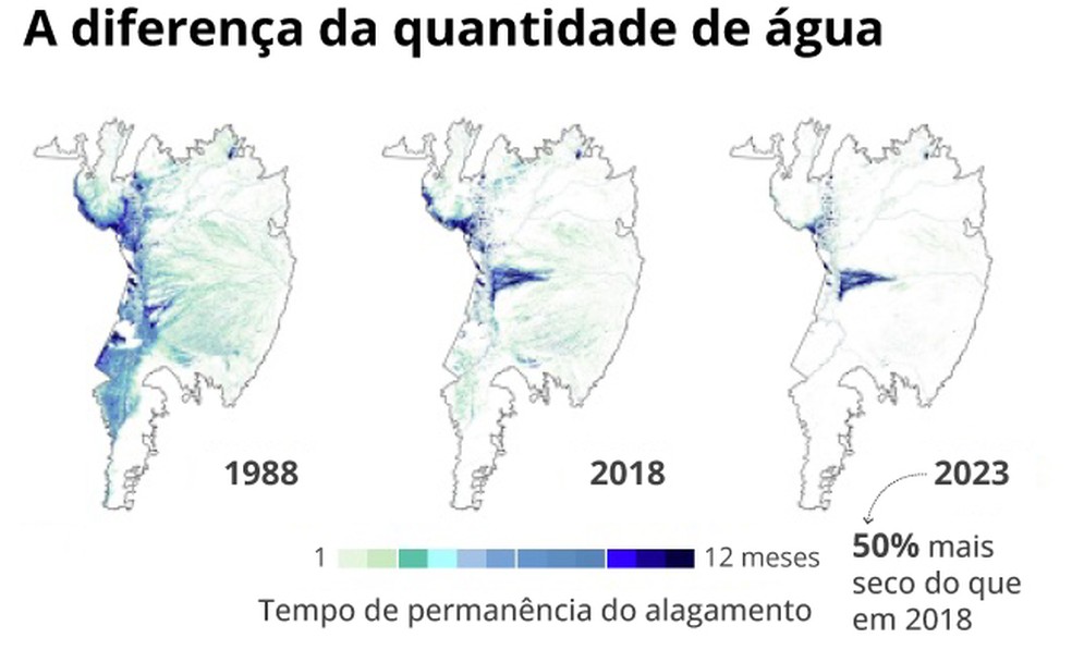 Em 2018 houve a última grande cheia do bioma,conhecido pelas suas áreas alagadas. Mas mesmo naquele ano a água já estava abaixo da média histórica. E o que era preocupante se agravou: em 2023,a superfície de 382 mil hectares representou metade da área alagada de 2018 e apenas 2,6% do bioma foi coberto por água.