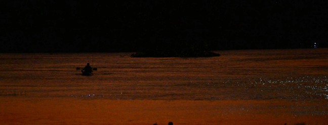 Moradores de Corumbá em barco no Rio Paraguai com o Pananal em chamas,ao fundo — Foto: Pablo PORCIUNCULA / AFP