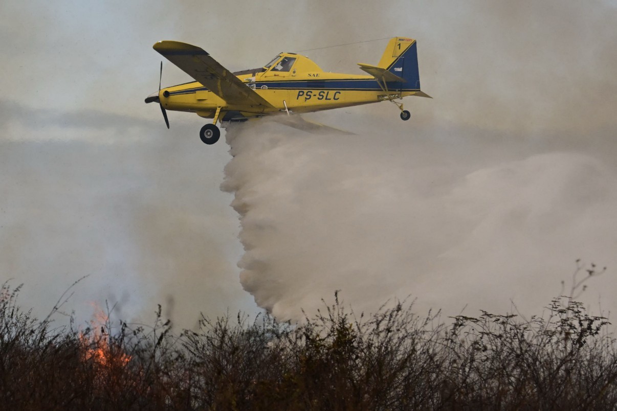 Avião do ICMBio despeja água sobre área em chamas no Pantanal — Foto: Pablo PORCIUNCULA / AFP