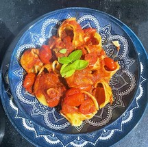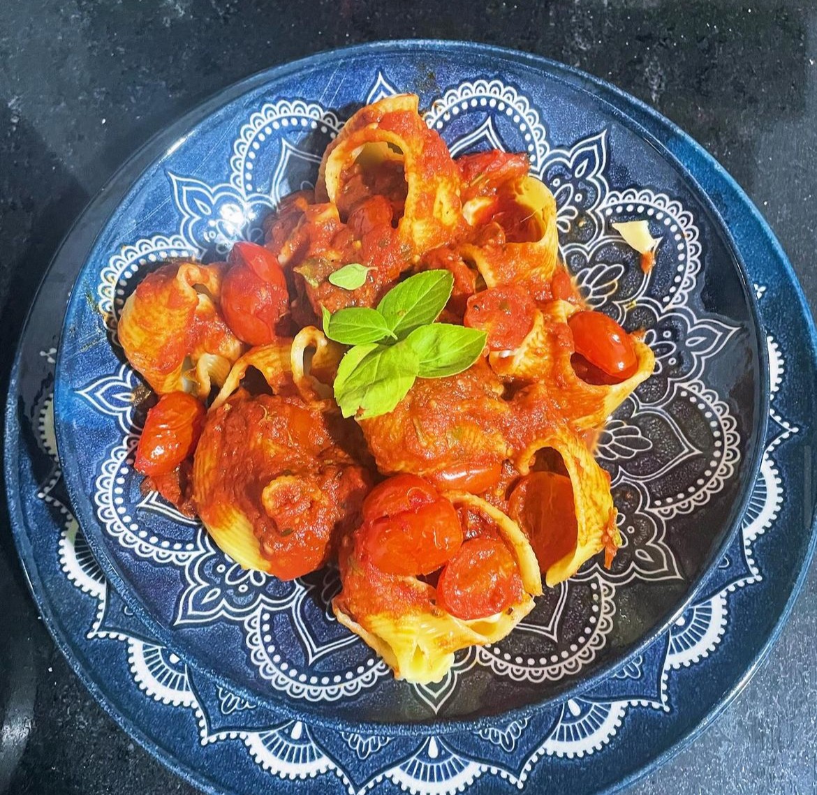 O conchiglione,um macarrão italiano em formato de concha,recheado com mozarela de búfala,tomate confitado e manjericão,é um dos sucessos do Cinque Terre — Foto: Divulgação
