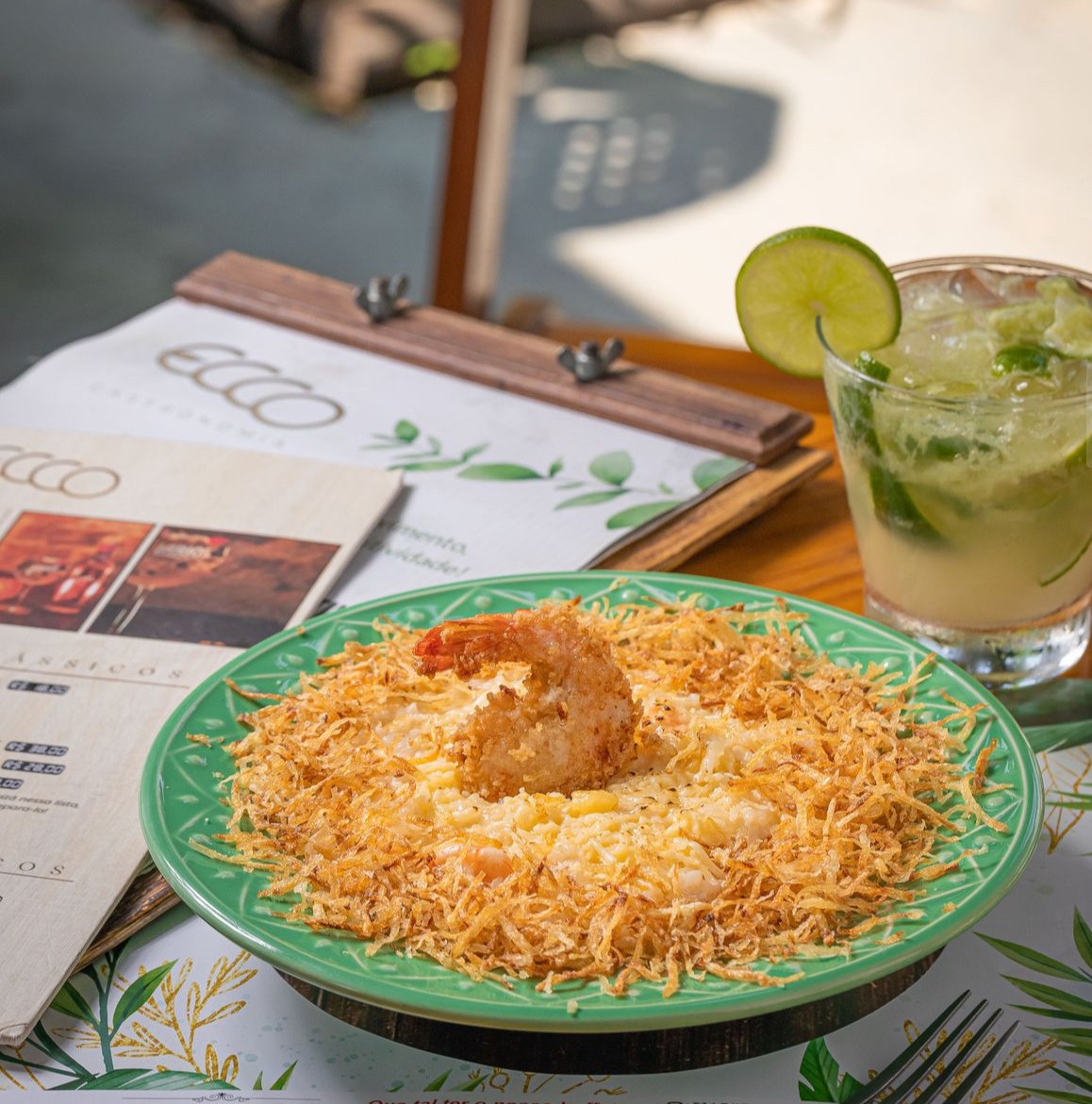 Um dos mais pedidos do Ecco Gastronomia,o arroz cremoso é preparado com suco e raspas de limão-siciliano e camarões refogados. Por cima,vão batalha palha fina e camarão empanado — Foto: Divulgação
