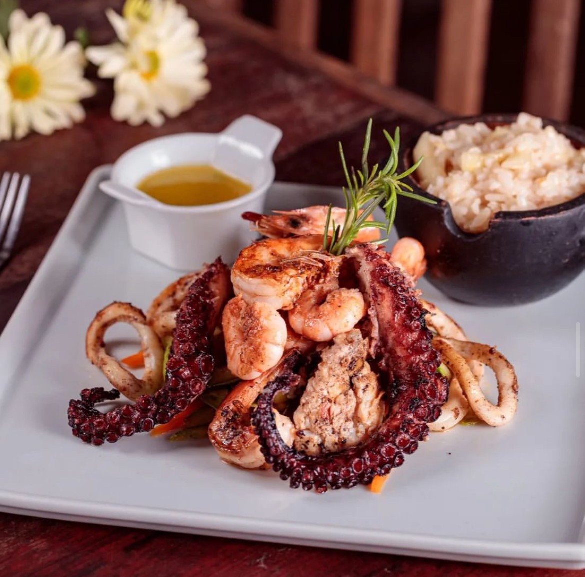 O grelhado de frutos do mar no Don Pascual,uma combinação de polvo,camarão,lula e salmão,servidos com arroz cremoso de açafrão,abacaxi grelhado,cenoura e brocólis — Foto: Divulgação