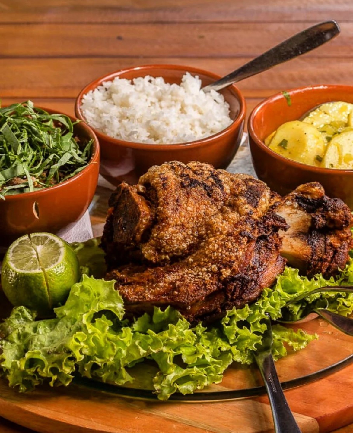 Uma das especialidades do Gugut Restaurante é o leitão pururuca,acompanhado de arroz,conserva de batatas e feijão tropeiro — Foto: Divulgação