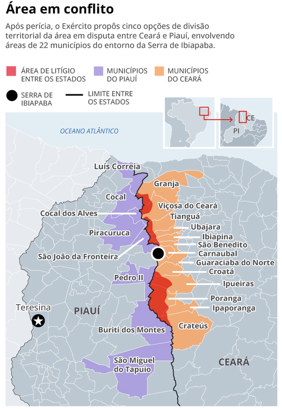 A briga,que desde 2011 está no STF,põe em lados opostos argumentos que envolvem decretos imperiais,análises topográficas e pesquisas socioculturais. O Exército admitiu que não foi possível definir a localização exata dos limites da região em litígio,que compreende 2,8 mil km² no entorno da Serra da Ibiapaba. Além do potencial turístico,essa área tem importância hídrica,por estar na bacia hidrográfica do Rio Parnaíba,e econômica,pela produção agrícola e os parques de produção de energia eólica.