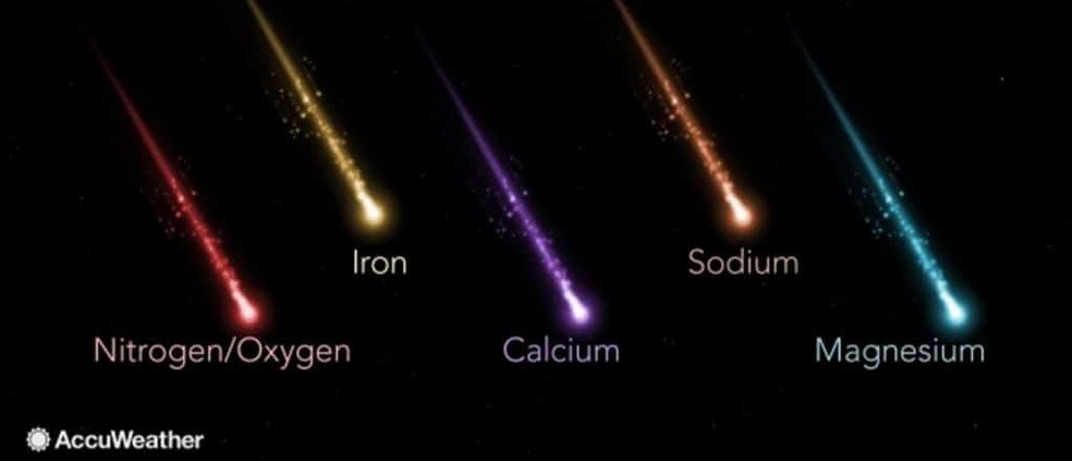 Algumas cores comuns de meteoros são: laranja-amarelado (sódio),amarelo (ferro),azul-verde (magnésio),violeta (cálcio) e vermelho (nitrogênio e oxigênio atmosféricos).