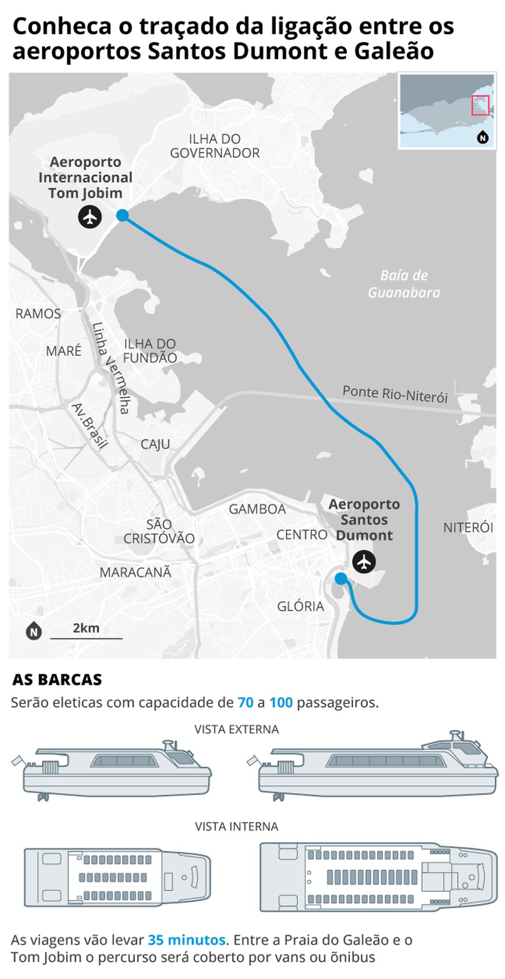 O serviço será feito por sete embarcações elétricas,com capacidade para transportar entre 60 e 100 passageiros. A prefeitura do Rio optou por embarcações de baixo calado para evitar a necessidade de realização de obras de dragagem na região. O trajeto funcionará todos os dias das 6h às 23h e durará cerca de 35 minutos entre duas estações: uma na região da Marina da Glória ao lado do Santos Dumont e outra na Ilha do Governador,na praia do Galeão.