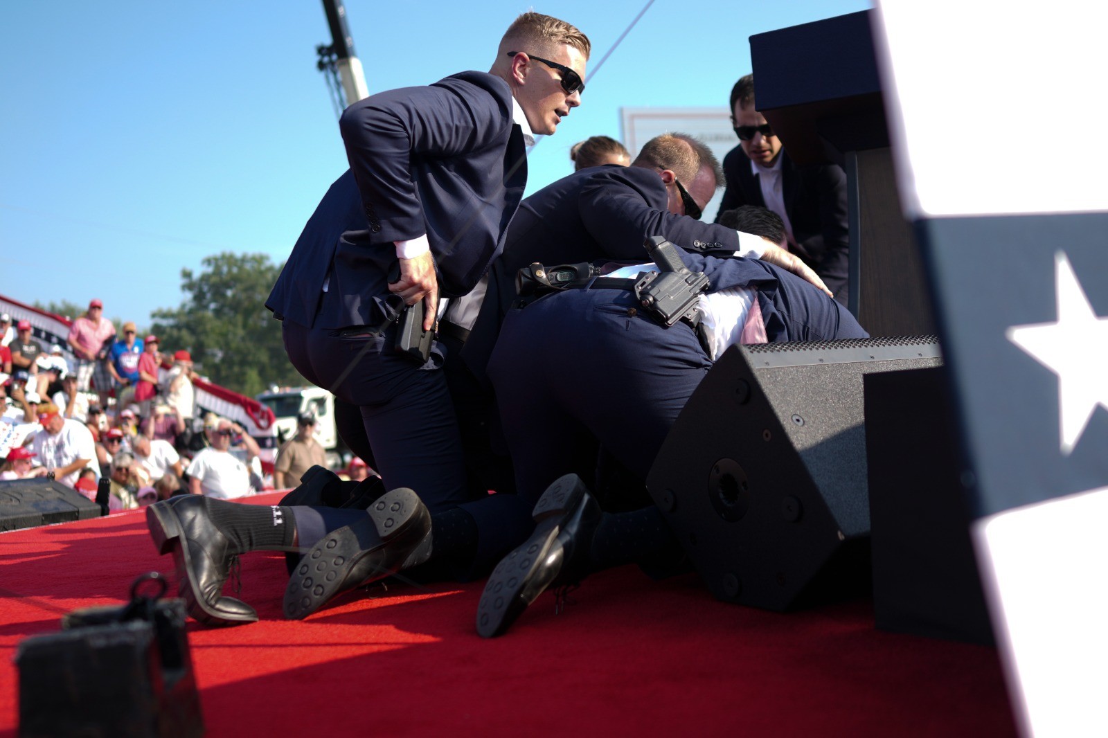 O Serviço Secreto atende o candidato republicano à presidência,o ex-presidente Donald Trump,no palco em um comício na Pensilvânia — Foto: AFP/Getty Images/ Anna Moneymaker