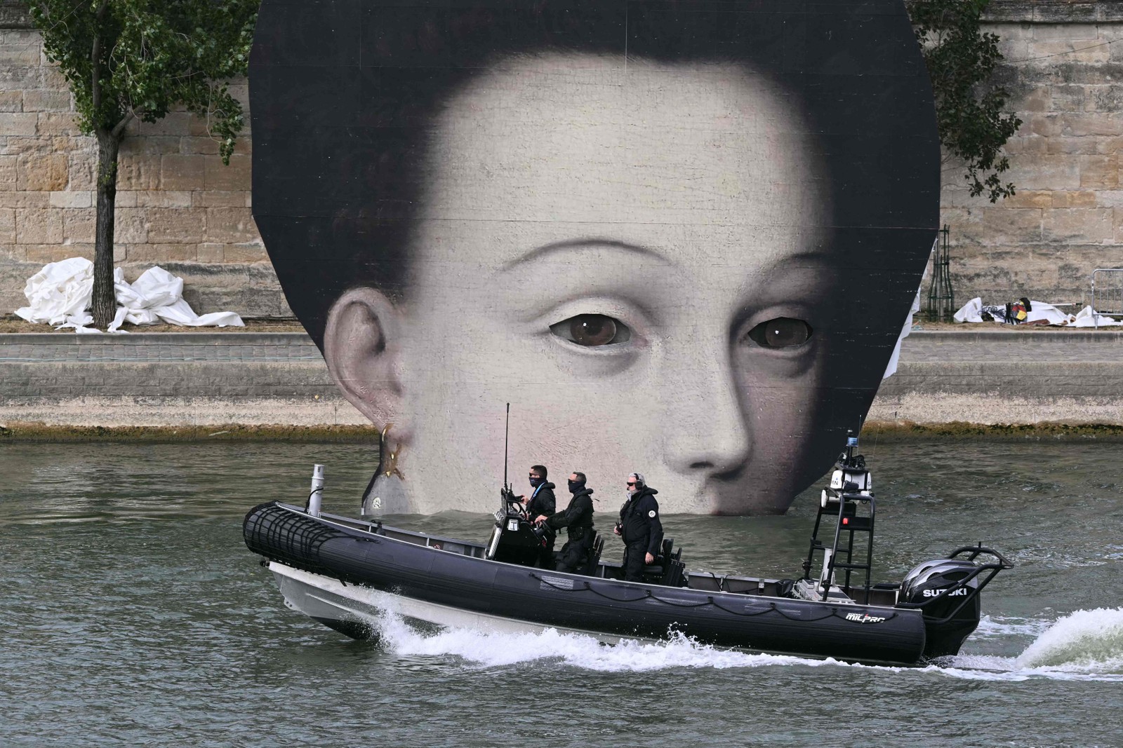 Barco navega pelo Sena diante de mural instalado para cerimônia de abertura de Paris-2024 — Foto: SEBASTIEN BOZON / AFP