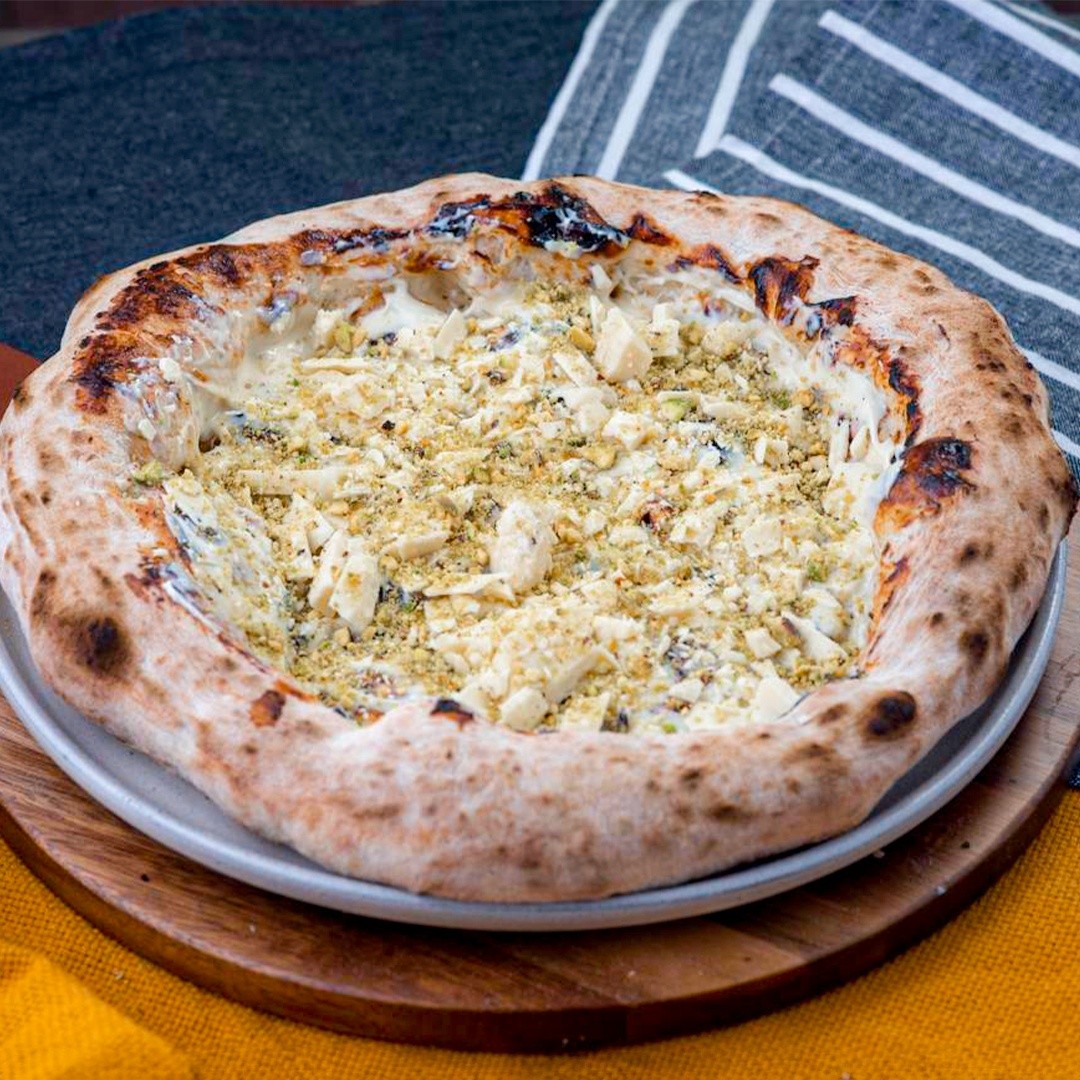 House Forneria. Pizza Pistachio Doce com massa de longa fermentação,pasta de Galak,pedaços de chocolate branco e pistache (houseforneria.com.br)