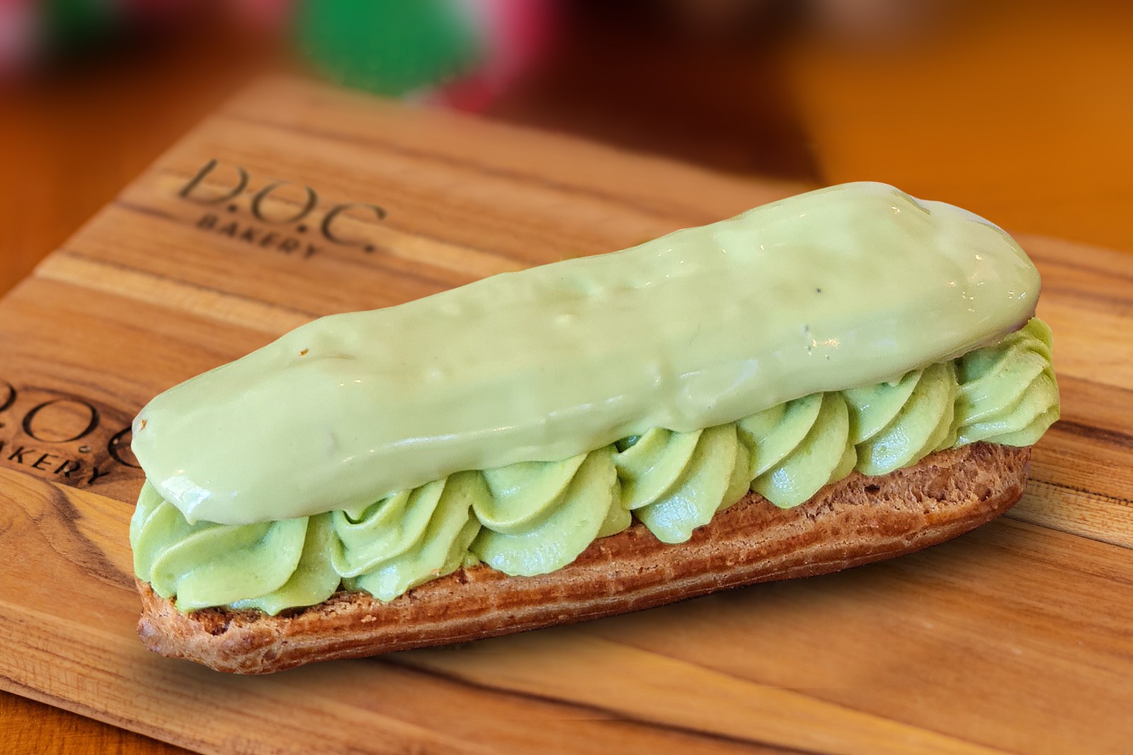D.O.C Bakery. Éclair com massa de fermentação natural (R$ 19) e recheio de creme de pistache (R$ 19) da confeitaria francesa (99805-2016) no Recreio — Foto: Divulgação