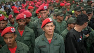 Membros da Força Armada Nacional Bolivariana (FANB) fazem fila em uma seção eleitoral durante a eleição presidencial venezuelana — Foto: Yuri CORTEZ / AFP