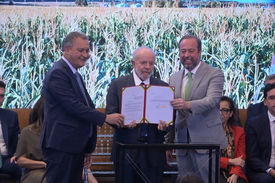 O ministro Rui Costa (Casa Civil),o presidente Lula e o ministro Alexandre Silveira (Minas e Energia) durante evento com anúncios para o setor de gás — Foto: Ricardo Botelho/ MME