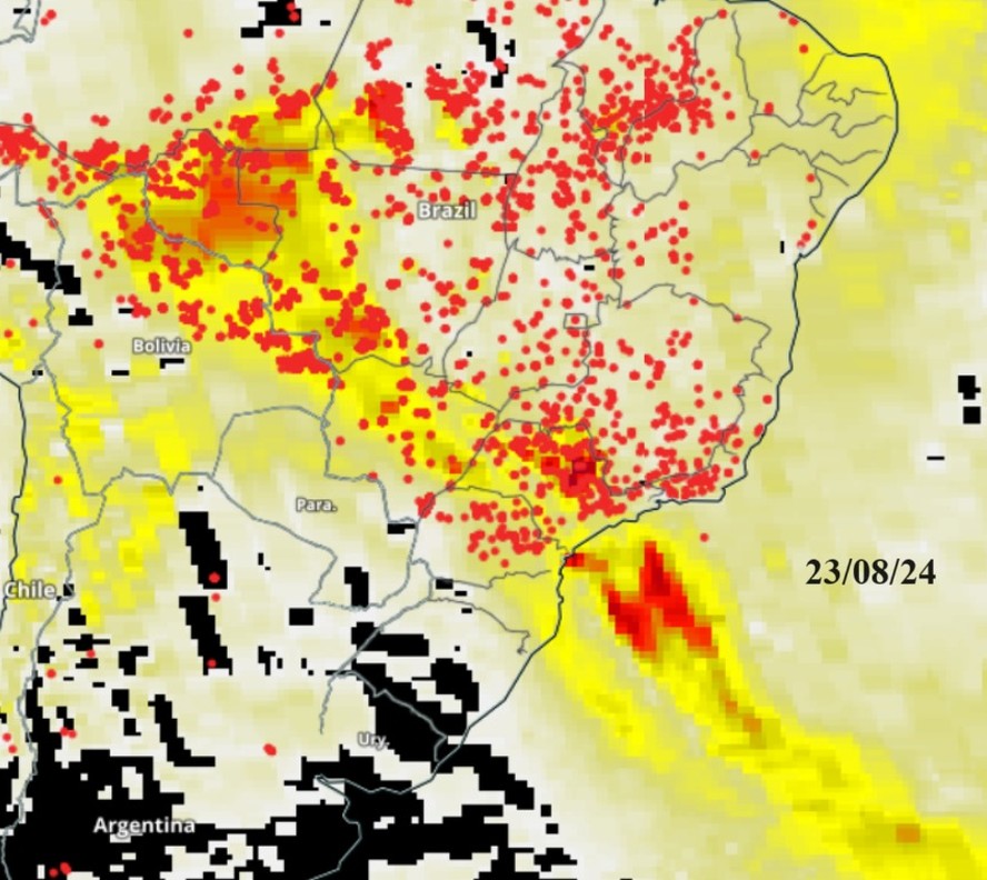 Imagem de satélite mostra focos de incêndio no Brasil no dia 23 de agosto — Foto: Reprodução RESUMOSem tempo? Ferramenta de IA resume para você
