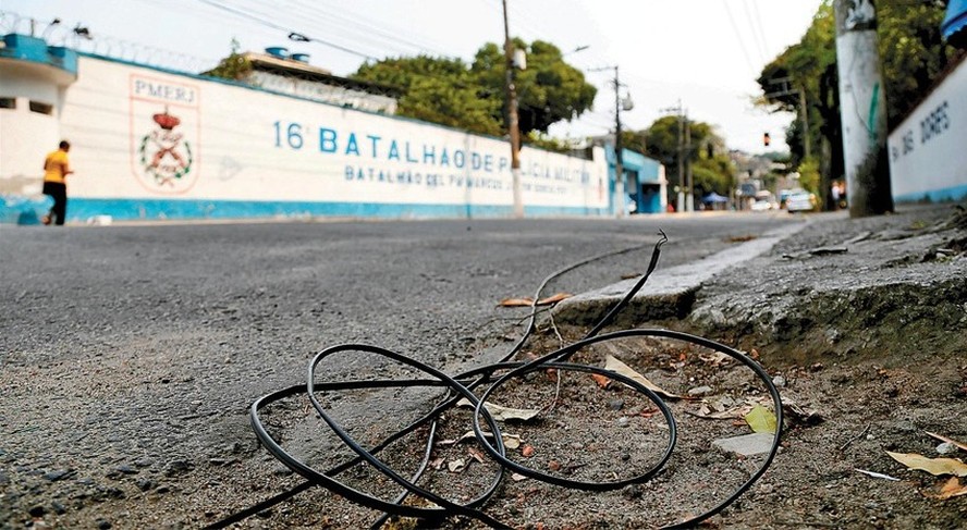 Moradores vizinhos ao 16º BPM (Olaria) afirmam que fios de operadoras formais foram cortados por milícia. PM diz que perda de conexão no batalhão foi causada por problema técnico — Foto: Agência O Globo / Fabiano Rocha
