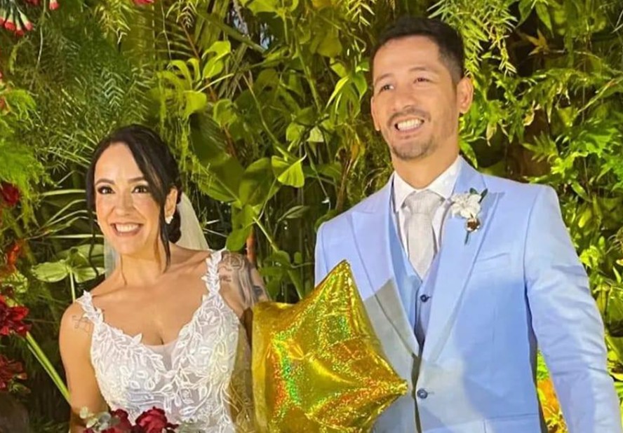 Fábio Toshiro e Bruna Vilarinho durante casamento — Foto: Reprodução RESUMOSem tempo? Ferramenta de IA resume para você