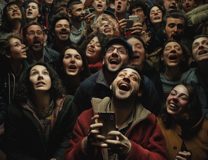 O que foi informado ao sistema: imagem hiper-realista retrata um homem tirando uma selfie com os amigos em um cinema lotado. As pessoas assistem a uma comédia e riem muito — Foto: Imagem gerada por Midjourney