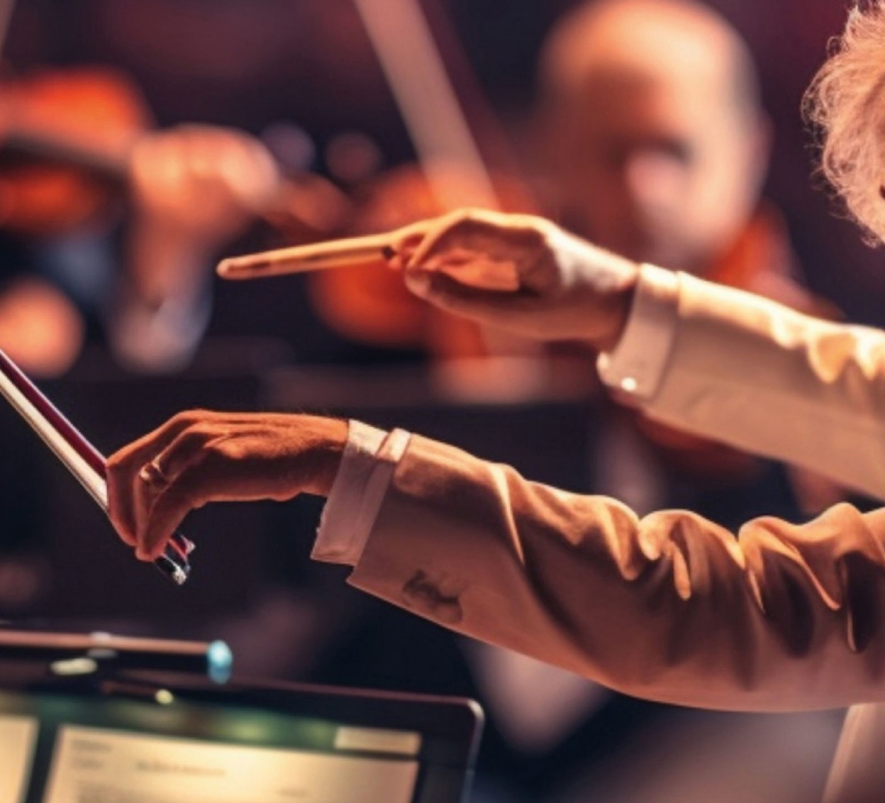Regência. A imagem exibe mão direita do maestro com dedo alongado. E a batuta se assemelha a um arco de violino — Foto: Imagem gerada por IA/Midjourney