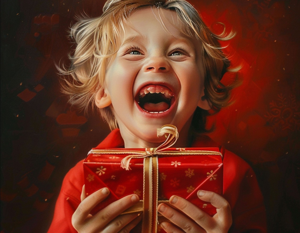 Alegria: Uma criança sorri imensamente feliz e até grita de boca aberta de tanta felicidade quando recebe um presente. Esta imagem serve como uma prova do poder da felicidade — Foto: Imagem gerada por IA/Midjourney