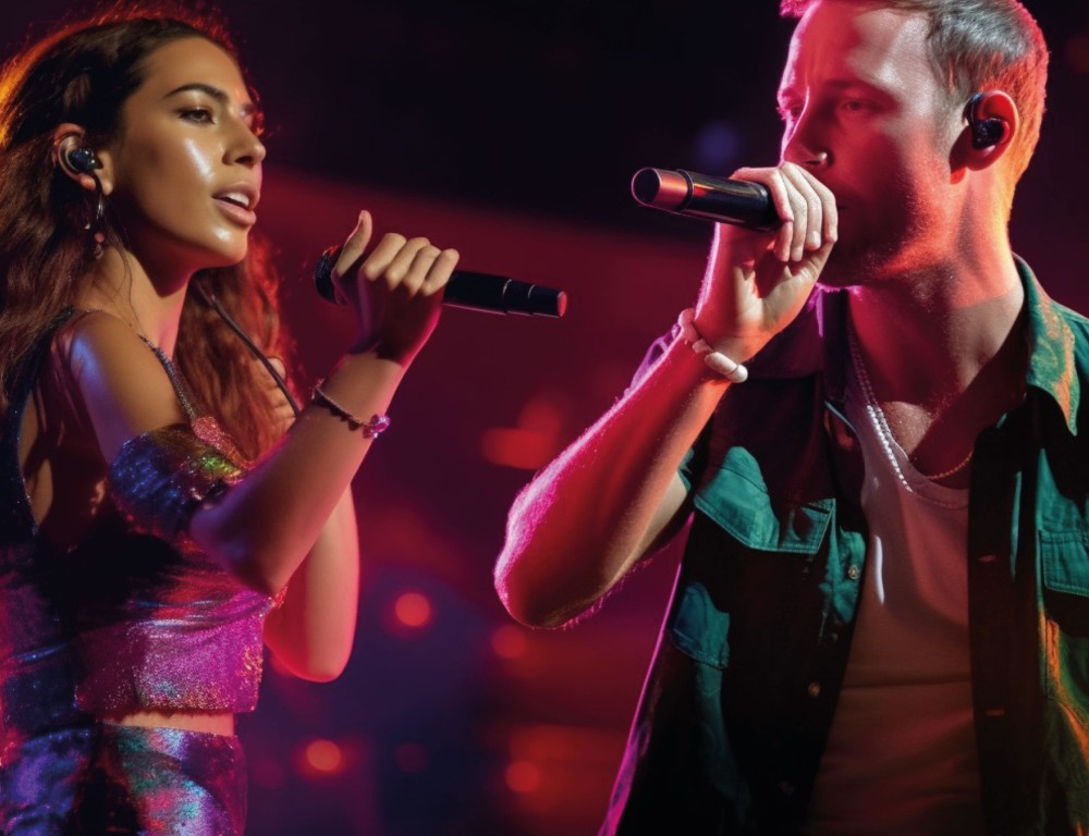 Dueto inusitado: Produção exibe a cantora brasileira Anitta cantando com o líder do Coldplay,Crhis Martin,dançando e cantando no palco,com luz de neon — Foto: Imagem gerada por IA/Midjourney