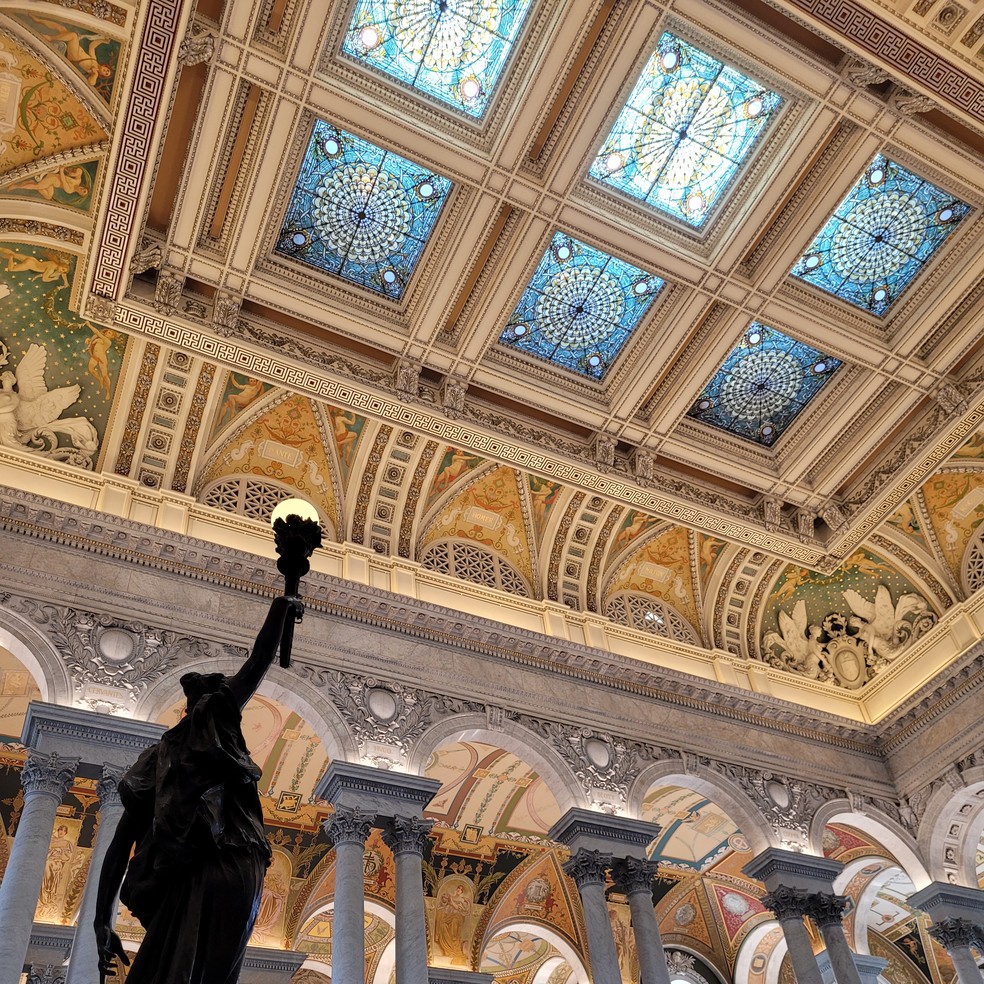 Um túnel leva do Centro de Visitantes do Capitólio à Biblioteca do Congresso (loc.gov/visit,entrada grátis). Reserve ao menos uma hora para este programa,porque certamente gastará longos minutos apenas observando a beleza do hall central do edifício Thomas Jefferson. As colunas,escadas,estátuas de bronze,vitrais e pinturas nos tetos,representando as artes e as ciências,remetem à opulência da “Era Dourada” americana,na virada do século XIX para o XX.