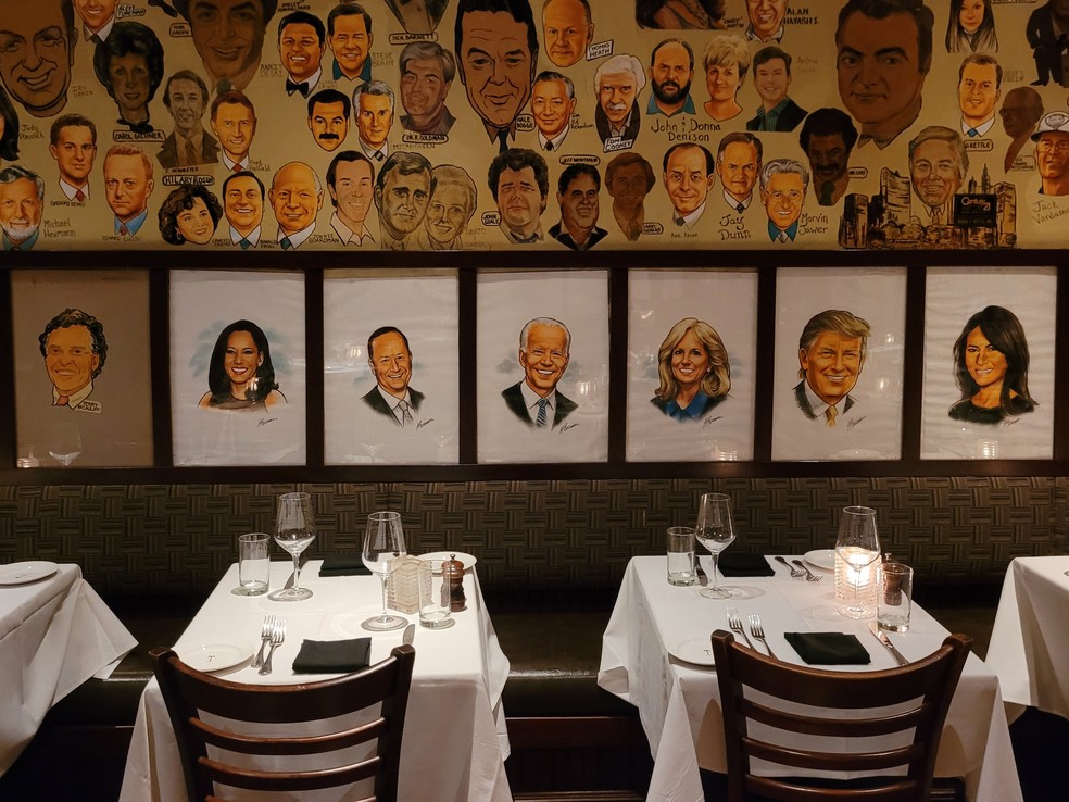 Um lugar historicamente frequentado por gente influente é o The Palm,restaurante nas proximidades do agitado Dupont Circle que oferece cortes de carne de boa qualidade,generosos pratos italianos e uma longa carta de vinhos. O tom sóbrio e elegante do salão,no entanto,é quebrado pelas paredes,cobertas por incontáveis caricaturas de políticos,artistas,jornalistas que já comeram por lá. Num canto específico há uma galeria de desenhos de todos os presidentes (e suas respectivas primeiras-damas) desde 1972,quando o restaurante abriu as portas. Estão lá,sorridentes e lado a lado,Donald Trump e Kamala Harris,representando a disputa de momento.