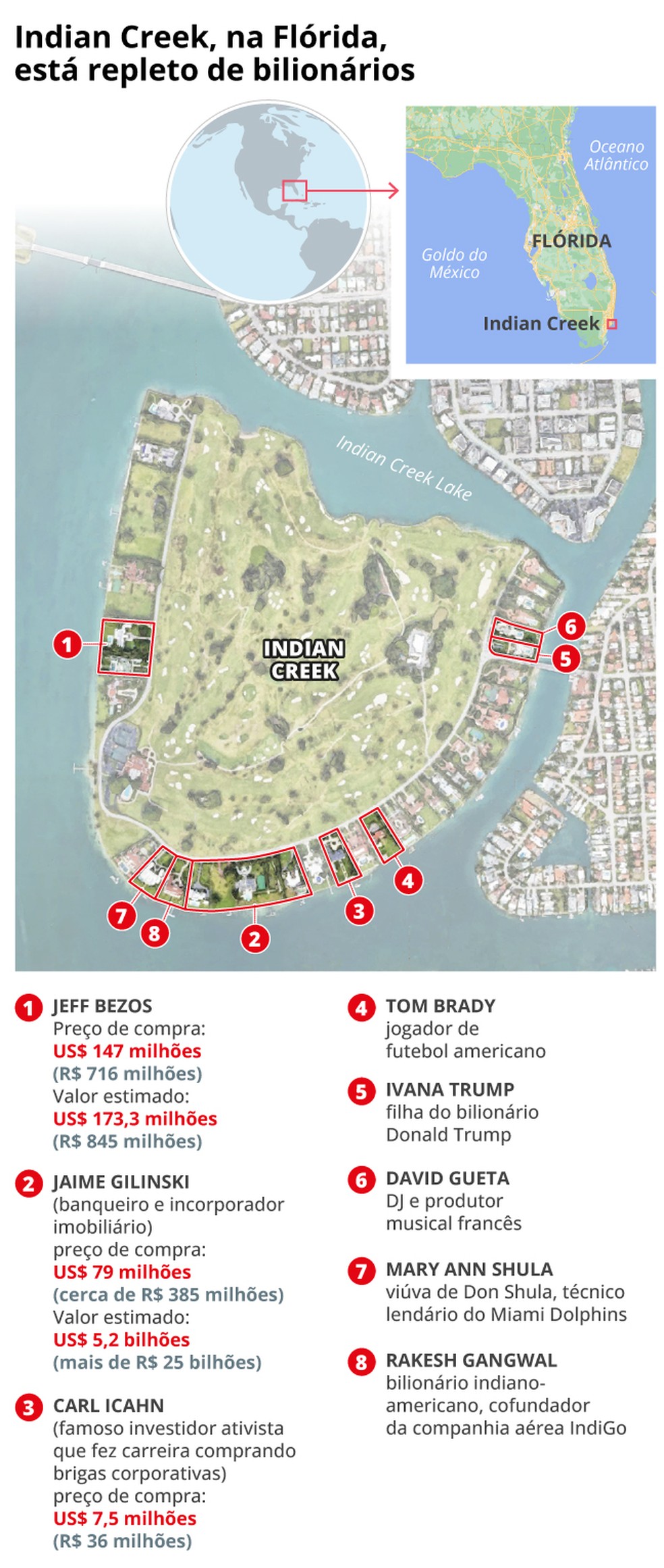O brasileiro vendeu a Jeff Bezos uma mansão de US$ 79 milhões (mais de R$ 446 milhões,na cotação atual) em Indian Creek,ilha artificial de Miami conhecida como "bunker dos bilionários". Projetada em um estilo que “irradia glamour europeu atemporal”,a propriedade conta com 1.770 metros quadrados,de acordo com o anúncio,e inclui uma piscina,um teatro,uma biblioteca e uma adega.