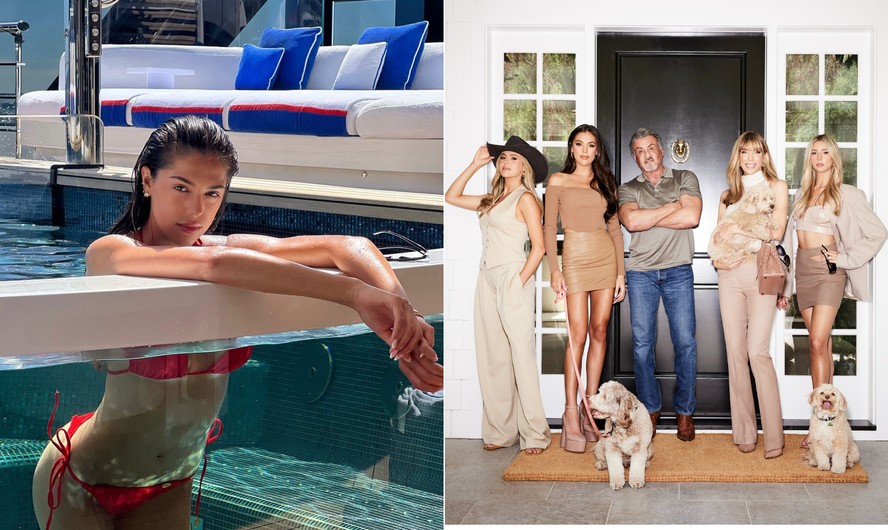 Sistine (à esq.),filha de Sylvester Stallone,e o ator com a família (à dir.) — Foto: Reprodução/Instagram e Art Streiber/Paramount+