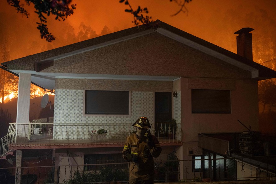 Bombeiro se comunica pelo rádio diante de uma casa ameaçada pelas chamas em Albergaria-a-Velha,onde morreu um brasileiro — Foto: Patrícia de Melo Moreira/AFP