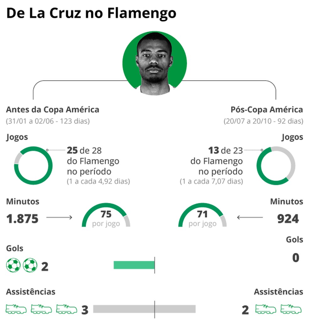 A Copa América,entre junho e julho,é um divisor de águas. Bem fisicamente,De La Cruz atuou em 25 partidas pelo Flamengo até se juntar ao Uruguai para o torneio de seleções. Isso dá uma média de um jogo a cada 4,92 dias. Ele participou diretamente de cinco gols (marcou dois e deu três assistências),além de toda sua importância em campo.