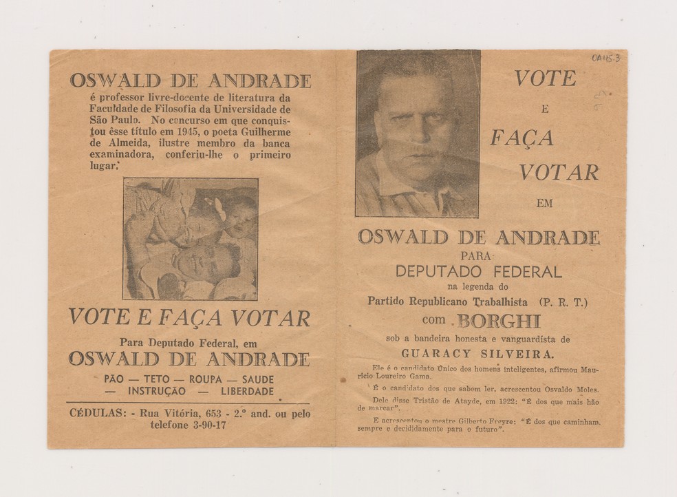 Panfleto de Oswald de Andrade em campanha para deputado federal: ativa participação na política — Foto: Divulgação/ Unicamp