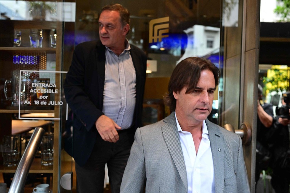 O candidato Álvaro Delgado e o atual presidente Luis Lacalle Pou deixam restaurante em Montevidéu — Foto: Pablo PORCIUNCULA/AFP