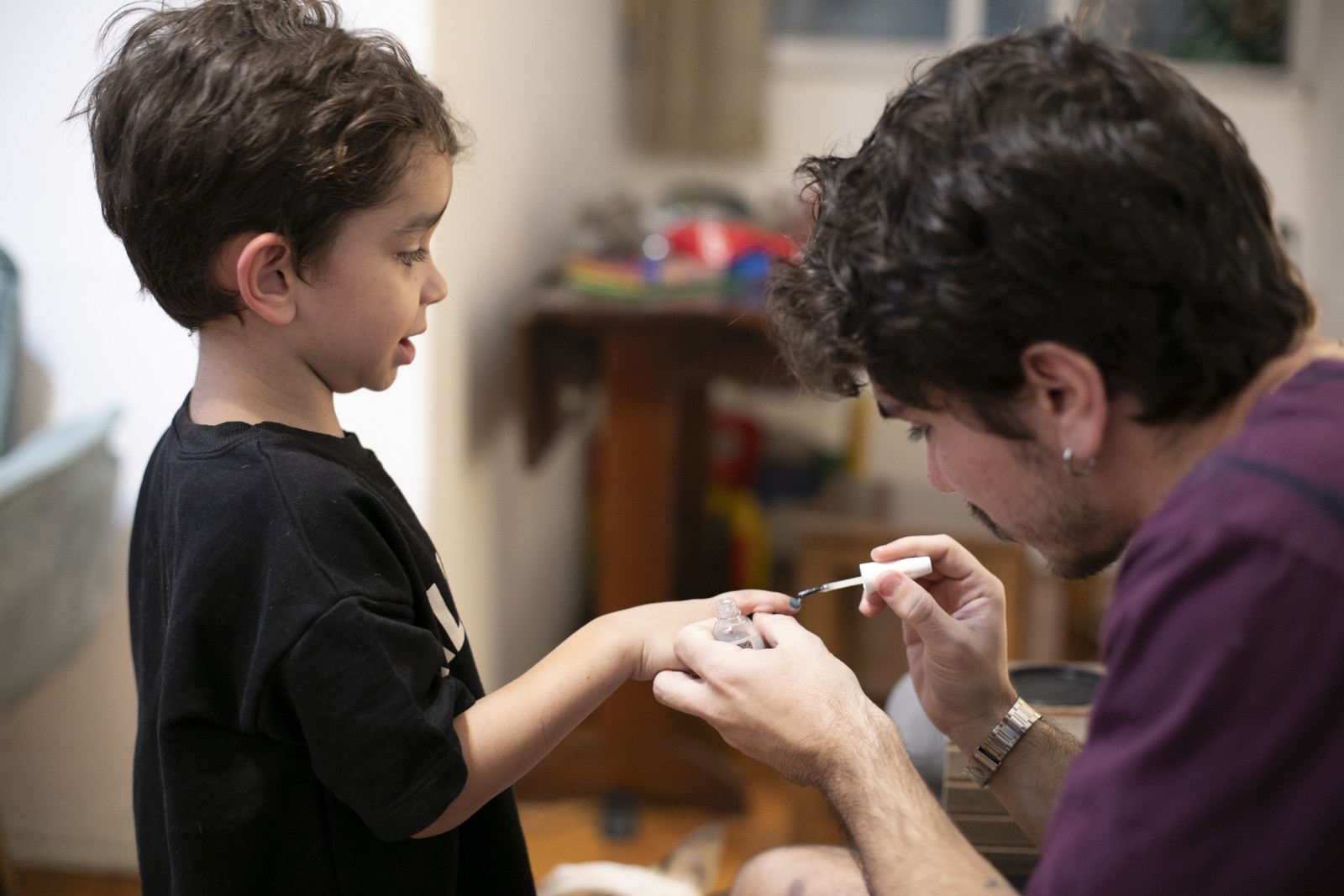 João Fernandes pinta a unha do filho,Nicolas — Foto: Guito Moreto
