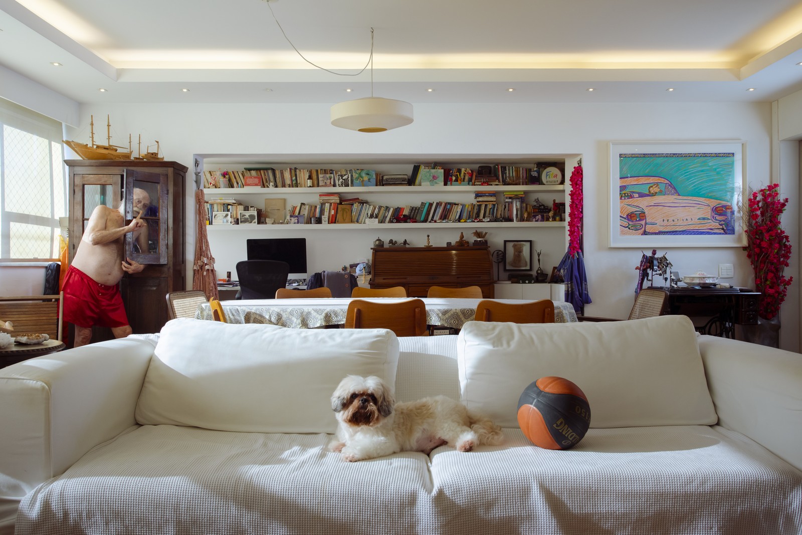 Ator na sala enquanto o cachorro Pitoco está no sofá — Foto: Leo Martins / Agência O Globo