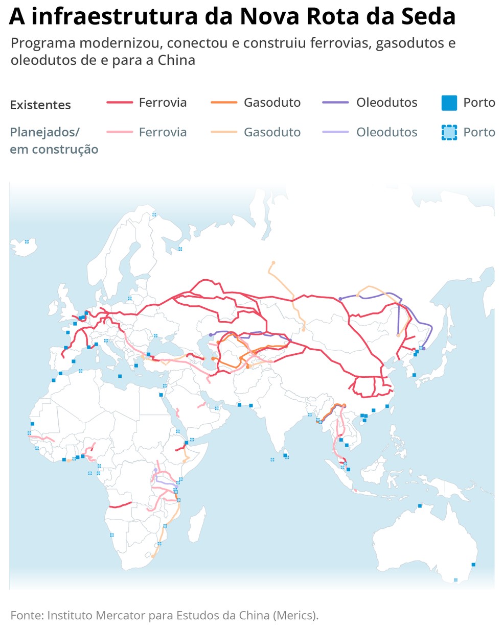 Um exemplo da BRI é a construção do Porto de Chancay,no Peru. Antes de vir ao Brasil para a cúpula do G20,no Rio,e da visita a Brasília,Xi passou por lá para inaugurar o terminal,que permitirá a conexão da América do Sul com a China,via Pacífico,em 23 dias e a um custo 20% menor,segundo a agência de notícias Xinhua.