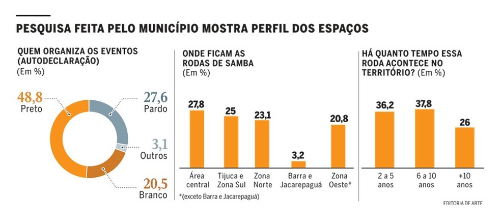 De acordo com o levantamento do município,a ginga e a batucada,normalmente em torno de uma mesa,estão espalhadas por toda a cidade,com 27,8% das rodas no Centro,25% na Tijuca e na Zona Sul,23,1% na Zona Norte (23,1%) e 20,8% na Zona Oeste. A cadência é menor na Barra e em Jacarepaguá,região que concentra apenas 3,2% do total.