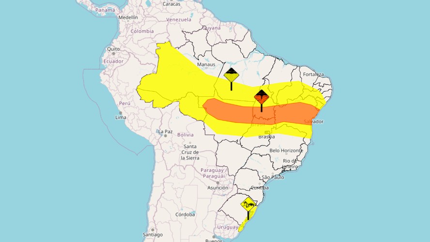 De forma mais branda,o Inmet também tem um alerta amarelo até a manhã desta segunda-feira de chuvas que pega outros estados do Nordeste,acima da Bahia,e o Norte de Minas Gerais,se estendendo para o Oeste do país,englobando partes de Goiás,Mato Grosso,Rondônia,Pará,Amazonas e Acre. São esperadas chuvas entre 20 e 30 mm/h ou até 50 mm/dia e ventos intensos (40-60 km/h).