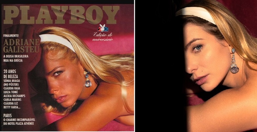 Adriane Galisteu na Playboy e a atriz que a interpreta na série 'Senna' — Foto: Reprodução e divulgação