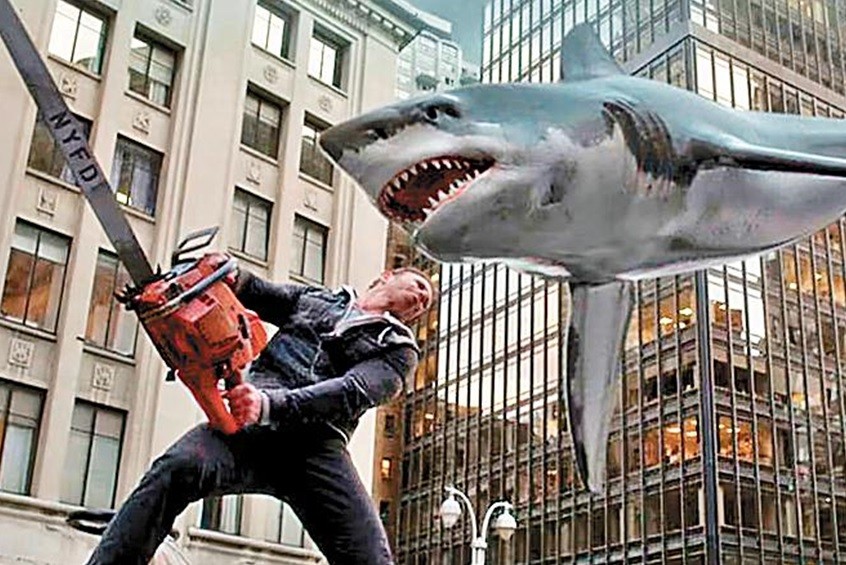 ‘Sharknado’ (2013). Trash raiz,longa tem motosserra contra tubarão voador — Foto: Divulgação