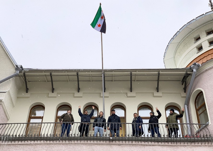 Bandeira associada à oposição síria é erguida na embaixada do país em Moscou — Foto: Andrey BORODULIN / AFP