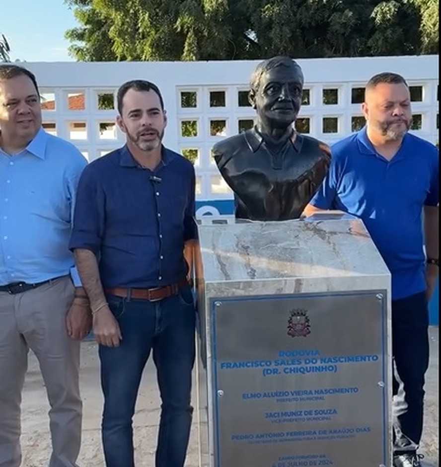 Elmar Nascimento (à esquerda),com o irmão,Elmo,prefeito de Campo Formoso,e o primo,Francisquinho,vereador: inauguração de estrada teve busto em homenagem a parente — Foto: Reprodução/Redes sociais