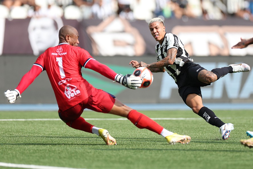 Carlos Alberto para nas mãos de Dida — Foto: Vitor Silva/Botafogo RESUMOSem tempo? Ferramenta de IA resume para você