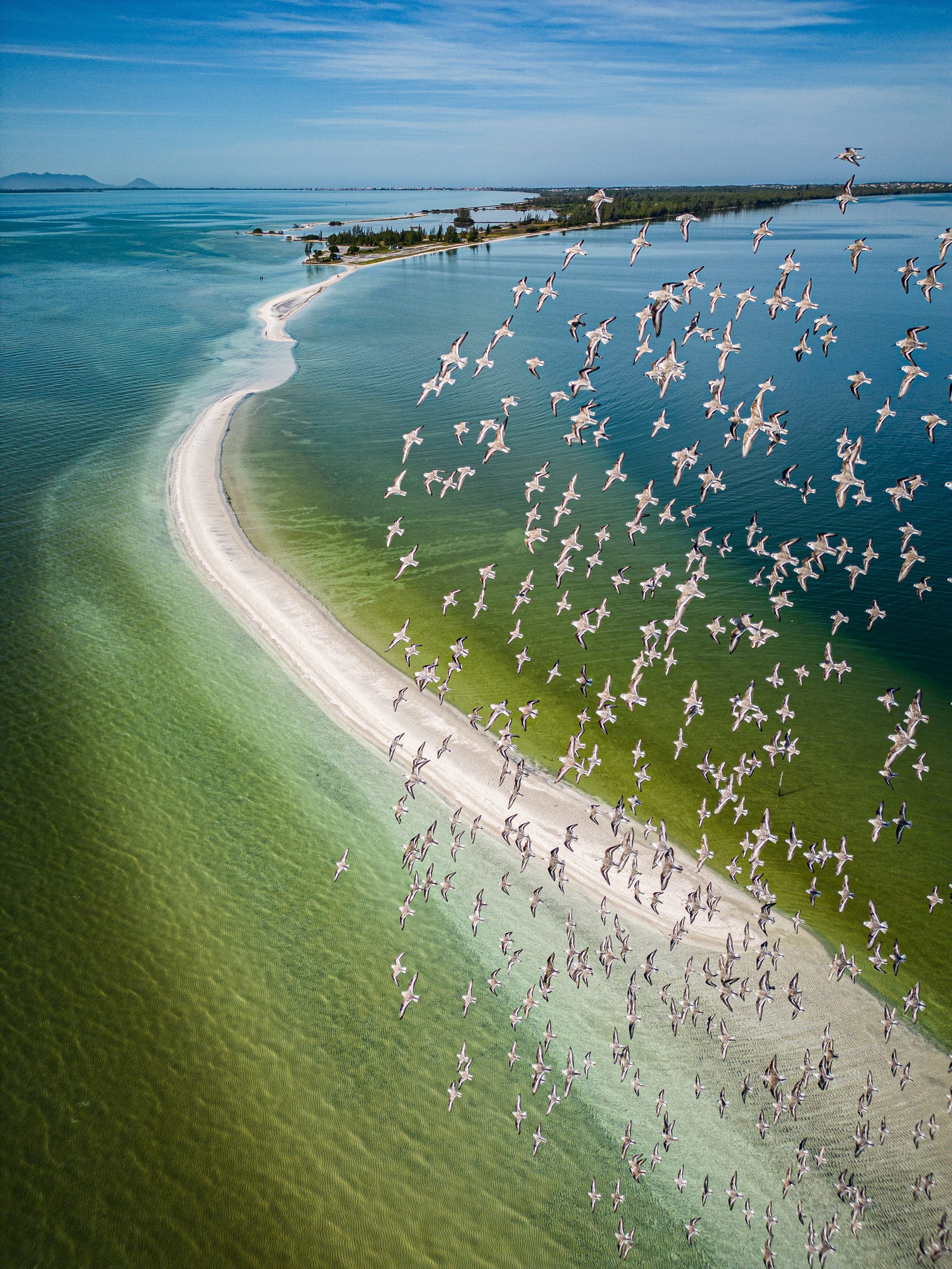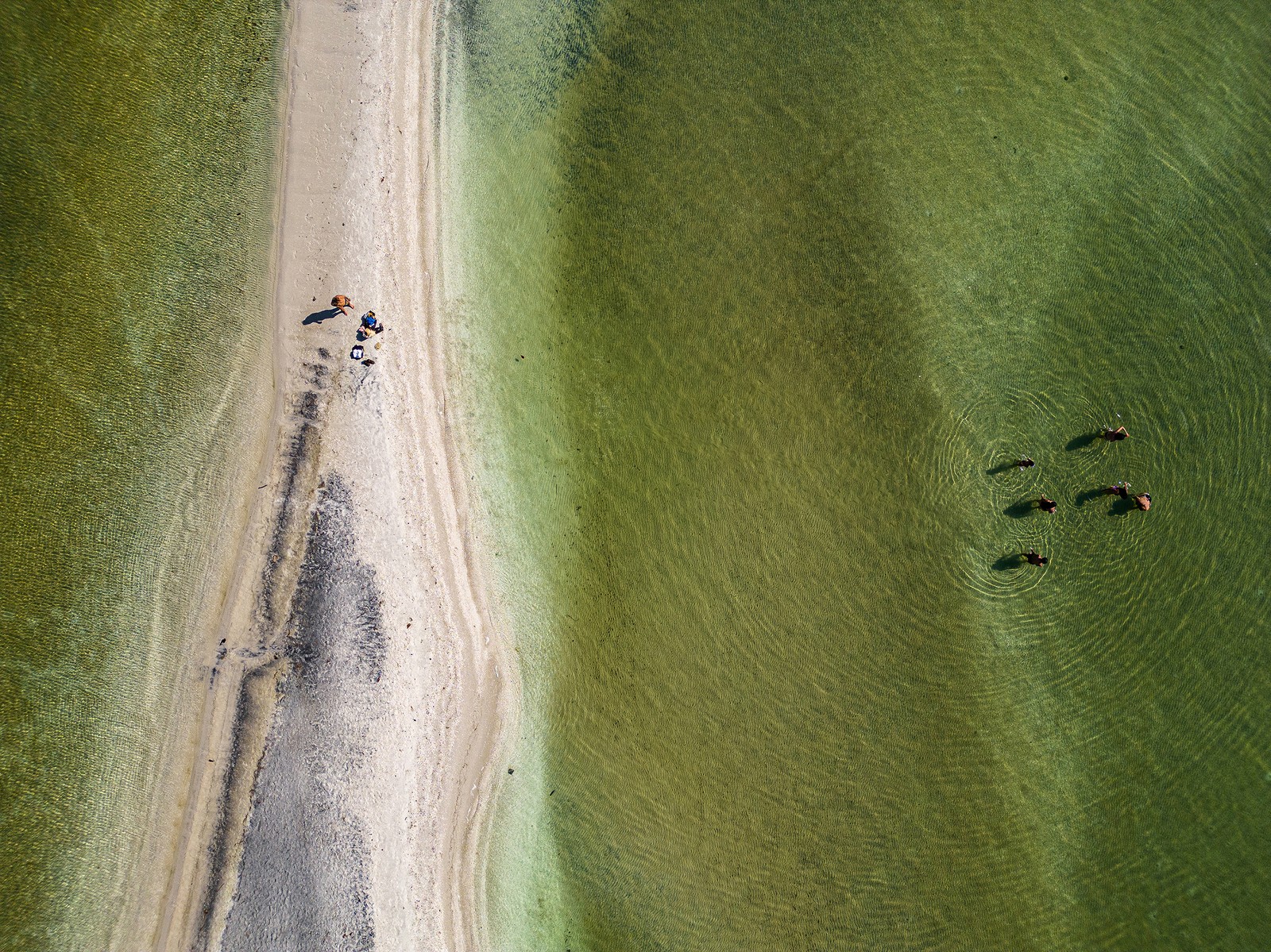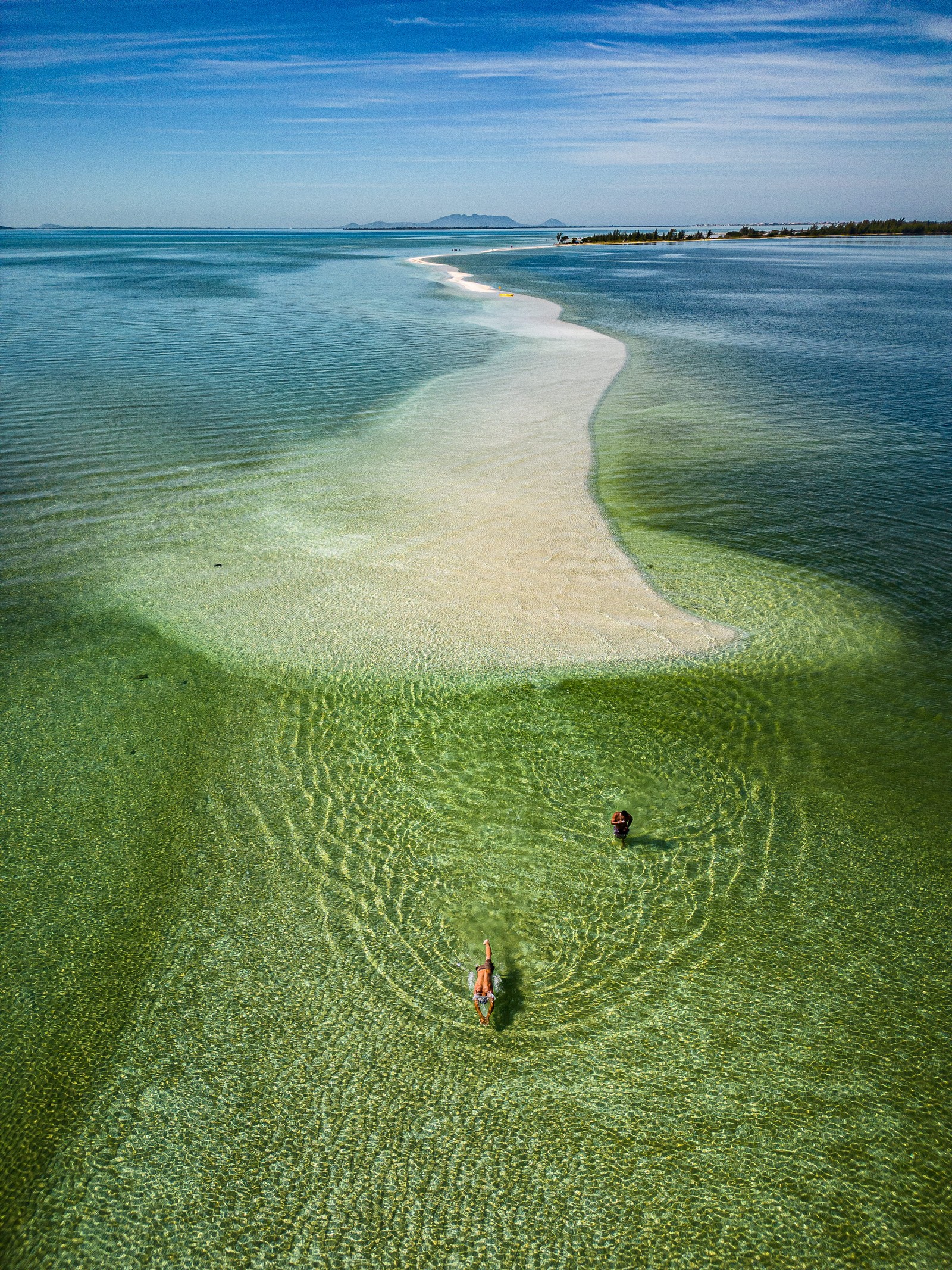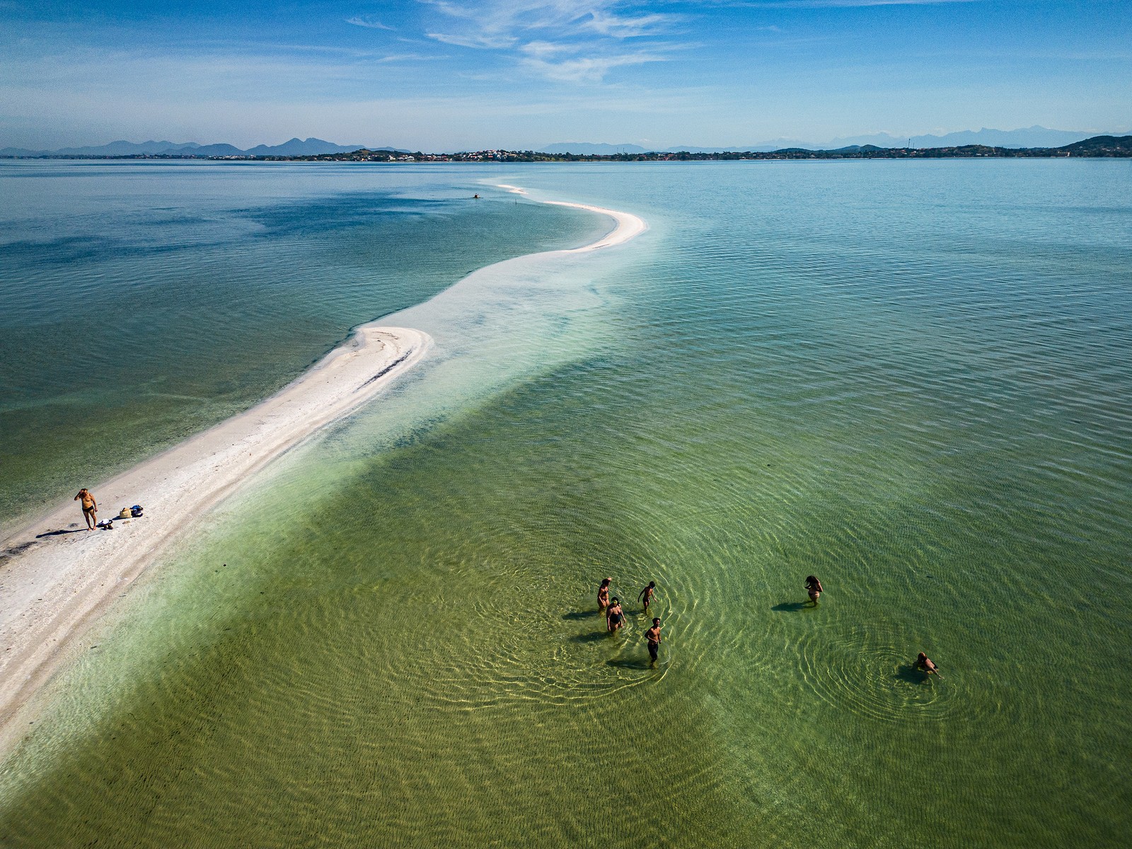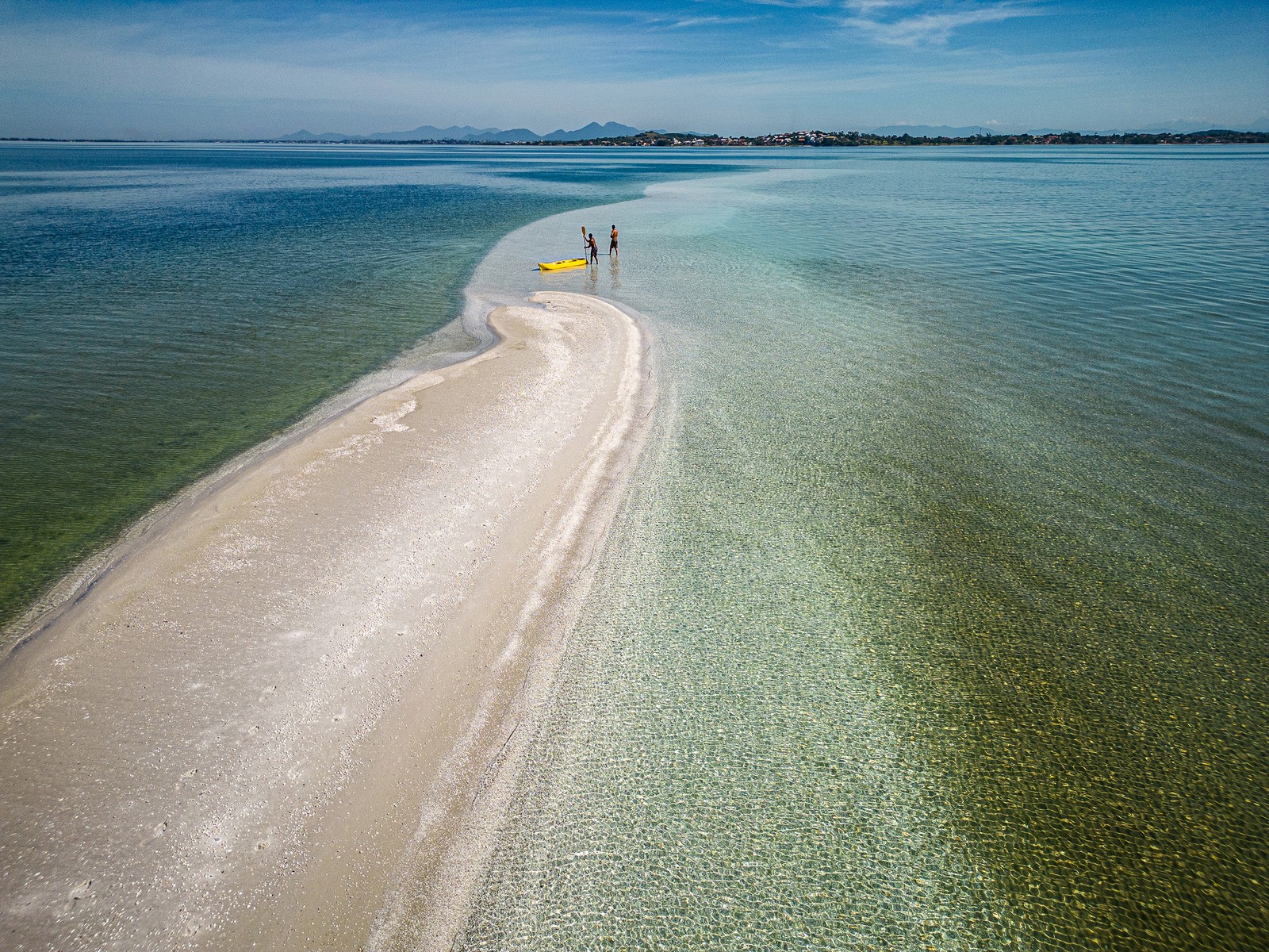 Caminho de areia em meio às águas surge em Arubinha em momentos do dia de maré baixa — Foto: Hermes de Paula / Agência O Globo