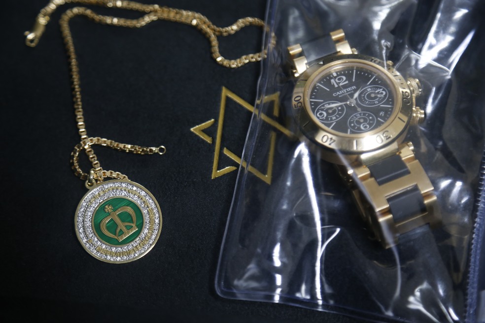 Joias apreendidas durante a ação. Uma delas tinha pingente com logo da Imperatriz Leopoldinense — Foto: Fabiano Rocha/Agência O Globo