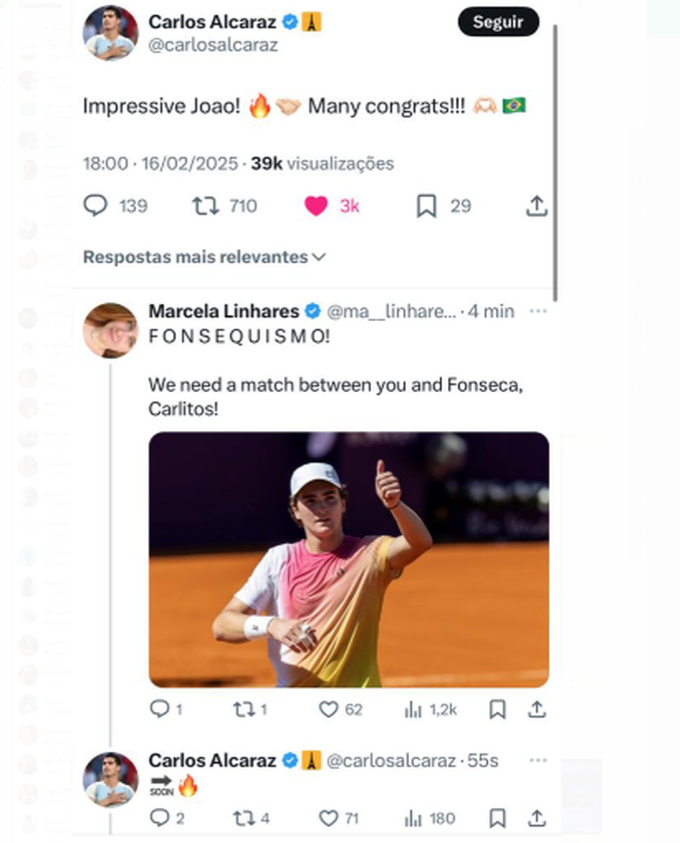 Em resposta,uma internauta brinca que João criou o "Fonsequismo",a torcida pelo tenista,e que todos estão ansiosos por um jogo entre o brasileiro e Alcaraz. O espanhol respondeu que será em breve.