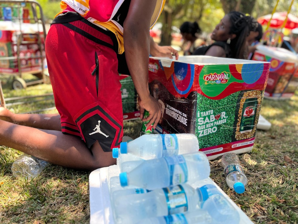 — Desde que eu cheguei,a bebida mais vendida é a água. É um bloco com muita criança,pessoas mais velhas,o perfil também pede por bebidas sem álcool e,como tá quente,a água sai na frente.