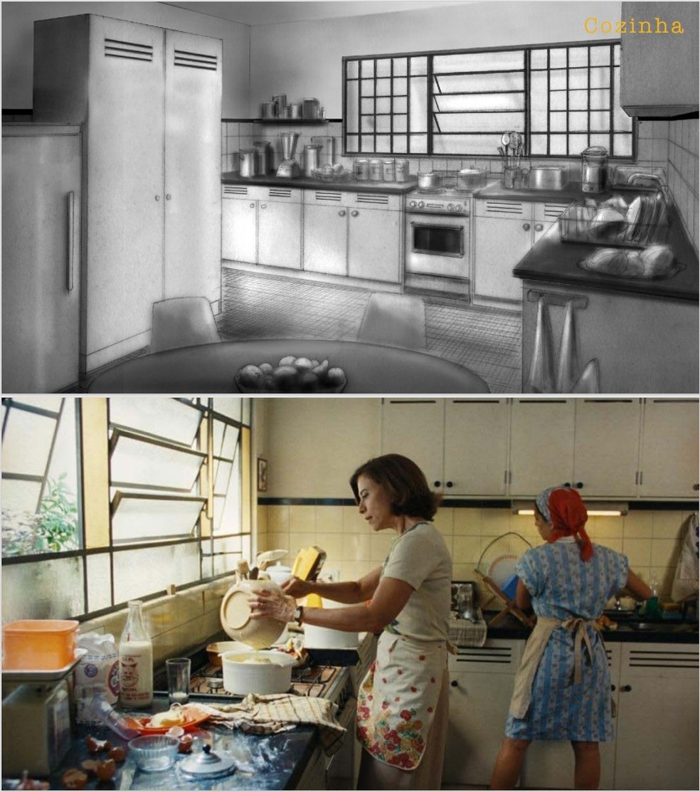 “A cozinha era toda moderna. Tiramos tudo,deixamos ‘de época’. Fabricamos armários de madeira e fórmica sob medida,conseguimos azulejo amarelinho liso que se usava nos anos 1960,conseguimos um fogão antigo. Que foi muito usado. Isso porque,em ‘Ainda estou aqui’,o Walter fez essa coisa inédita na carreira dele: o elenco ficou ensaiando um mês e meio no próprio cenário antes de começar a filmar. Enquanto a gente ia reformando e mobiliando a casa,os atores já estavam ensaiando lá. Nesse processo,a cozinha foi uma das primeiras peças a ficar pronta. Então,se alguém queria fazer um chá,alguma coisa,a cozinha estava à disposição.”