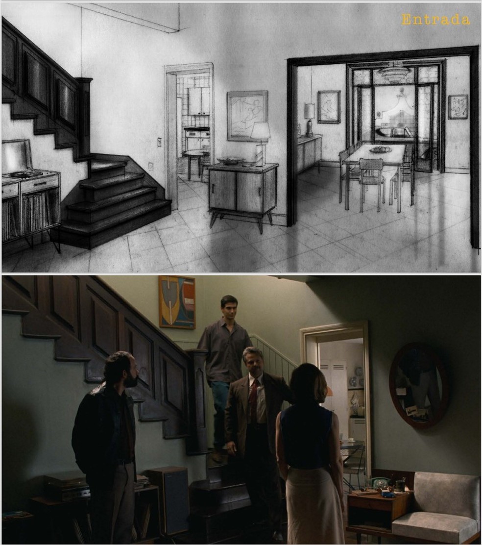“Os filhos de Rubens e Eunice contaram tudo de que se lembravam da casa do Leblon. Acontece,porém,que as memórias de uns eram um pouco diferentes das dos outros. Foi interessante falar com cada um e misturarmos todas essas ideias. A sala,por exemplo,é uma grande construção em cima das recordações de cada um. Mas isso era um ponto de partida,um ‘start’. Eu repetia: ‘Estamos fazendo cinema,tem que funcionar na tela,a câmera precisa circular. Temos uma cena de dança com umas 20 pessoas dentro de casa: precisamos de espaço!’ No final,mesmo com algumas liberdades criativas,os filhos adoraram a casa,se sentiram transportados.”