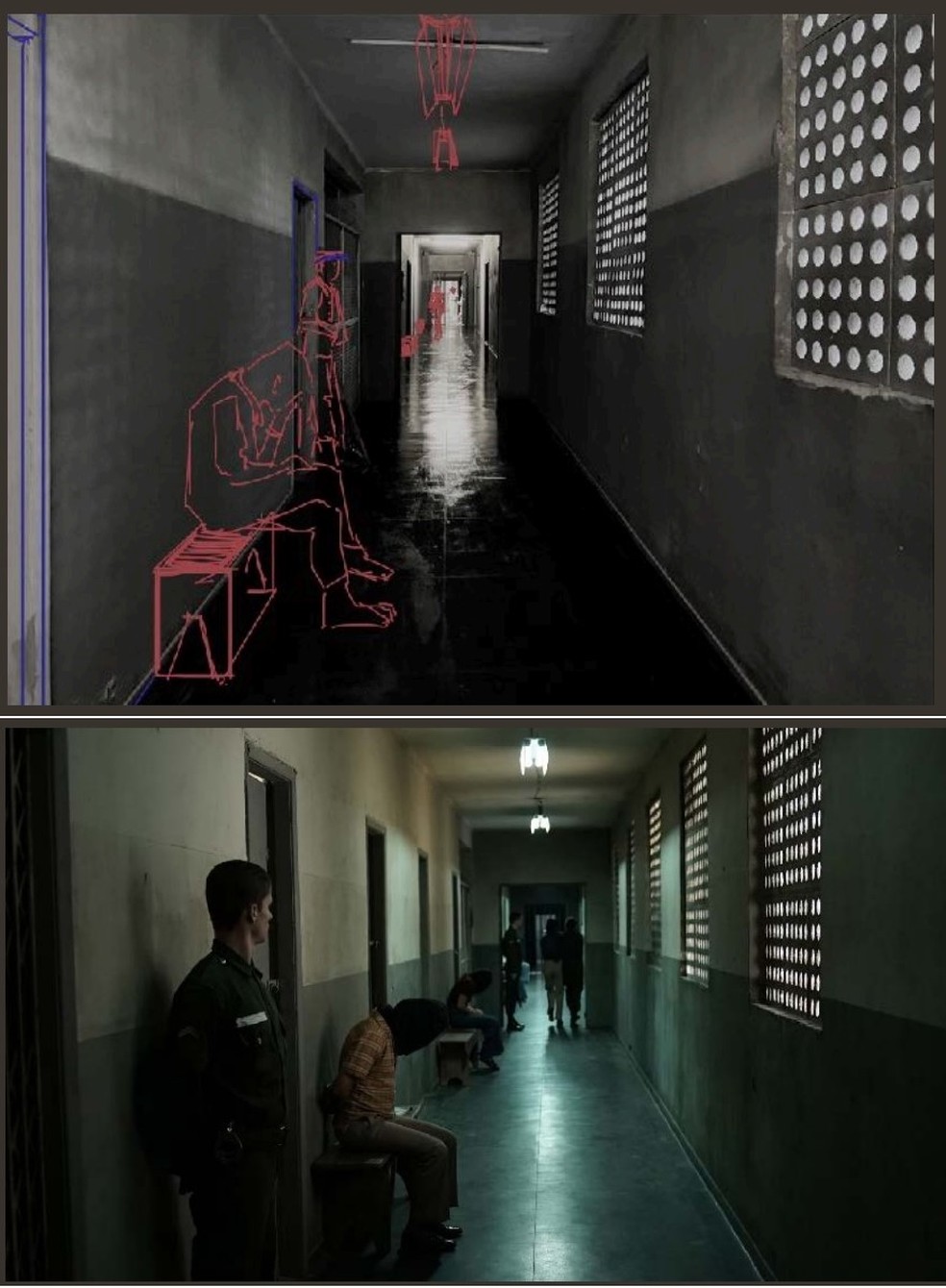 “Fizemos muita pesquisa de imagem,inclusive em arquivos de outros países da América do Sul que passaram por regimes autoritários,para criar o cenário do DOI-Codi (Destacamento de Operações de Informações — Centro de Operações de Defesa Interna,para onde agentes da ditadura levaram Rubens Paiva em 20 de janeiro de 1971 e onde ele foi torturado e morto). Na tela vemos um misto de locações reais com estúdio. Construímos,as celas com paredes removíveis,para poder colocar a câmera onde fosse necessário. Para contrastar com a casa dos Paiva,muito iluminada,criamos ambientes bem escuros. Mas com o chão iluminado: em muitos depoimentos,surge a imagem do chão sempre sendo lavado. Os militares não queriam deixar manchas de sangue.”