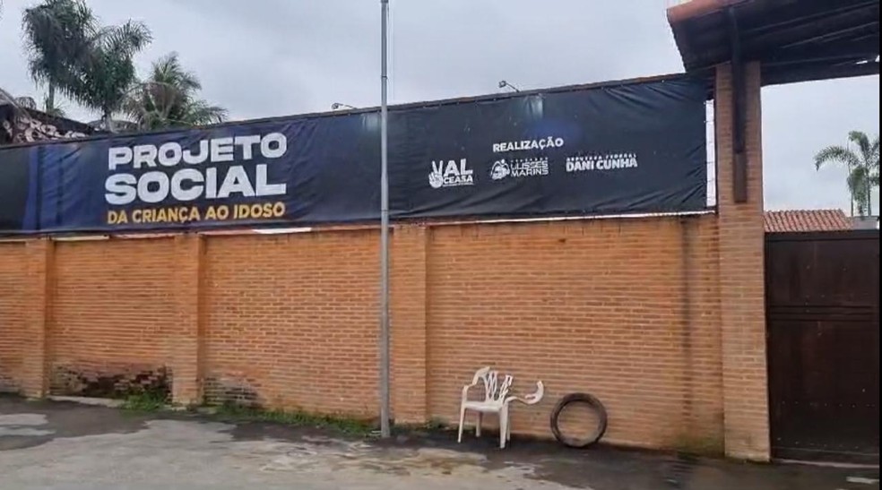 Fachada de imóvel em que ficava 'resort' em Parada de Lucas,com banner mencionando políticos — Foto: Reprodução